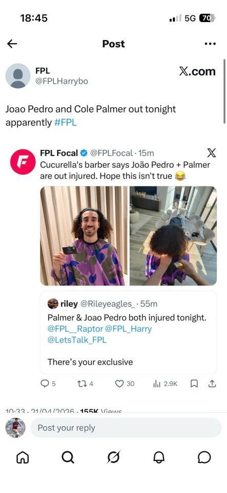 当地时间周二早些时候,库库雷利亚的理发师在社交媒体发布了这一消息,他写道:“帕尔默和若昂-佩德罗今晚双双因伤缺阵了。这是给你们的独家消息(艾特FPL资讯账号)。”配图则是他正在为库库雷利亚修剪头发的照片。